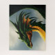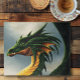 Porträtprofil eines grünen Drachen. Hinter dem Drachen thront ein blauer Himmel.