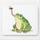A green frog with large spots extends its tongue to catch a fly, sitting against a neutral background, showcasing a playful, lively artwork style reminiscent of Matsumoto Hoji.