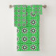 A set of green towels with a black and white geometric pattern hangs neatly on a rod. Below, a matching washcloth is displayed, showing its soft texture.