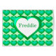 Diese Karte weist ein sich wiederholendes Muster grüner Herzen auf, mit einem gläsernen Aussehen, überlagert von einem großen weißen Herz, das in grün umrissen ist und eine Textvorlage enthält. Die Karte ist innen leer.