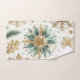 Festliches und elegantes Badetuch mit einem grünen und goldenen Urlaubsmuster mit Aquarellfloralen, Schneeflocken, Kiefern-Blätter und Ziergegenständen. Es verbindet geometrische und abstrakte botanische Elemente mit einer boho-böhmischen Touch und eignet sich ideal für den Winter- und Herbstbadbau.