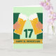 Designed with two stylized hands in warm, muted tones, the card shows them lifting tall mugs of golden ale toward each other in a close toast that feels like an easy moment between friends. Each mug is filled with pale gold beer, dotted with small bubbles, and topped with thick white foam, with a few extra fizz marks floating near the rims. In the middle, a dark green “17” sits prominently between the glasses, drawing your eye to the center as the mugs angle inward. A wide golden banner stretches across the lower area, carrying the words “HAPPY ST. PATRICK’S DAY” in deep green letters. Behind everything, the background shifts between light mint green and a deeper forest green, creating simple contrast without extra clutter. The tight spacing of the clinking mugs adds a hint of warmth and closeness, like a shared laugh over a first sip ☘️. Small green accents and the rich gold tones keep the scene festive, with a little extra luck in the air 💚. The foam crowns are bright white against the greens, and the banner’s gold sits neatly along the bottom edge beneath the centered “17.”