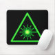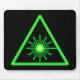 Schwarzes Mousepad mit leuchtend grünem Laserwarnsymbol.