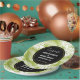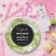Personalisierte Hochzeitspapier-Teller mit einem sich wiederholenden Muster großer Blätter aus Palmen auf einem olivgrünem Hintergrund. Ein schwarzer Kreis mit einer goldenen Grenze überlagert mit den personalisierten Details innen.
