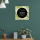 Ein viereckiges Hochzeitplakat mit einem sich wiederholenden Muster großer Palmen-Blätter auf einem Olivenhain. Moderne und tropische Atmosphäre. Ein schwarzer Kreis mit einer goldenen Grenze überlagert mit den personalisierten Details innen.