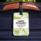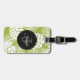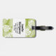 Personalisierter Gepäckanhänger mit einem sich wiederholenden Muster großer Blätter aus Palmen auf einem Olivenhain. Moderne und tropische Atmosphäre. Ein schwarzer Kreis mit goldenem Innenrand überlagert mit den personalisierten Details innen und hinten.