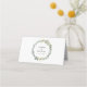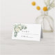 Elegant folded greenery and eucalyptus wedding place card with soft watercolor botanicals and blank lines for handwritten guest details.