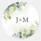 Grüne Wedding Classic Round Aufkleber. Dieses stilvolle und elegante Hotel bietet eine wunderschöne, handbemalte Aquarellgarage. Finden Sie passende Artikel in der Grüne Eukalyptus Floral Collection.