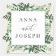 Siegel Sie Ihre Einladung Kuverts oder Favoriten mit diesen eleganten botanischen Hochzeitsaufklebern im Winter mit Ihren Namen gerahmt durch einen quadratischen Rahmen von üppigen Aquarellblättern in Grüntönen, auf einem weichen cremefarbenen Elfenbeinhintergrund. Koordiniert mit unserer Hochzeitskollektion.