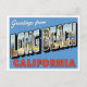 Capture the sunny charm of Southern California with this vibrant vintage-style "Greetings from Long Beach, California" postcard! This classic large-letter design features the city name in bold, eye-catching script set against a bright blue background with bold red lettering for the state. Inside the block letters, you'll find scenic vignettes of Long Beach life, including the famous shoreline, towering palm trees, the downtown skyline, and relaxing beach scenes. This design perfectly embodies the mid-century travel aesthetic.