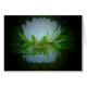 Une grenouille repose devant un lis d'eau blanche et est encadrée par le lis et réfléchit à la surface de l'eau.
