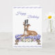 Niedlicher Windhund auf einem lila Sofa mit einem Hut und einem Monokel. Niedliche und lustige Geburtskarte