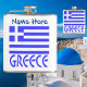 Personalisierter Kolben mit der griechischen Flagge und dem Wort GRIECHENLAND unten in blau. Die Flagge zeigt blaue und weiße Streifen mit einem blau-weißen Kreuz in der oberen rechten Ecke. Oben, in blauen Buchstaben, fügen Sie einen Namen für eine besondere Touch oder erstellen Sie ein Geschenk. Es macht Spaß, Ihre Ouzo oder Metaxa für die Reise einzupacken. Ideal, um den Oxi Day zu feiern.