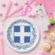 In diesem Design findet sich das Wappen Griechenlands (offiziell als Hellenische Republik bekannt), eines Landes in Südosteuropa. Die Hauptstadt Griechenlands ist Athen, die zugleich die größte Stadt des Landes ist, gefolgt von Thessaloniki. Weitere wichtige Städte in Griechenland sind Patras, Piräus, Larissa, Heraklion, Peristeri, Kallithea, Acharnes, Kalamaria, Nikaia, Glyfada, Volos, Ilio, Ilioupoli, Keratsini, Evosmos, Chalandri, Nea Smyrni, Marousi, Agios Dimitrios, Zografou, Galeo, Nea Ionia, Ioannina, Palaio Faliro, Korydallos, Trikala, Vyronas, Agia Paraskevi, Galatsi, Agrinio, Chalcis, Petroupoli, Serres, Alexandroupoli, Xanthi, Katerini, Kalamata und Kavala. Das Wappen besteht aus einem weißen griechischen Kreuz auf einem blauen escutcheon (ein technischer Begriff für ein heraldisches Schild), umgeben von zwei Lorbeerzweigen.