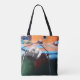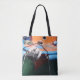 Farbenfrohe Tasche auf beiden Seiten mit einem Bild eines griechischen Fischerbootes bedruckt. Das Schiff ist orange und blau und hat das symbolische böse Auge auf der Seite gemalt. Ich nahm dieses Foto während meines Urlaubs in Griechenland.