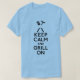 Hellblauer T - Shirt mit "Behalt Calm and Grill On" in fett schwarzen Buchstaben mit Grillutensilien und einem Hotdog. Sehen Sie sich die gesamte Vatertag-Bekleidungskollektion in den SPEZIELLEN TOUCHS an | Abschnitt Gastgeschenke.