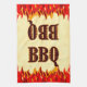 Handtuch, das GRILLEN in einem Schriftart mit Flammen in einem Western liest, mit roten und orangefarbenen Flammen am unteren Ende des Designs auf einem Hintergrund aus Pergament aus Imitaten.