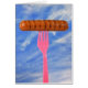 Grillhund auf rosa Kunststoffgabel mit Sommerhimmel