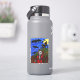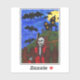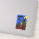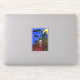 Dieser Vinyl-Aufkleber hat ein grimmiges Sensenmann Skelett in einem Kapuzenrot, stehend von einem Holzzaun vor einem Spuk Haus und Friedhof aus schwarzer Silhouette mit Fledermäusen, die unter einem großen gelben Mond fliegen.