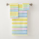 Serviette de bain avec arrière - plan en jaune et combinaisons à bandes alternées en bleu pastel, vert, rose et blanc. Des décors identiques composés d'arrière - plans de bleu pastel, vert et rose roux. Ce design a aussi des rideaux de douche de couleur SOLID et des nattes de bain en bleu pastel, vert, jaune et rose vif assortis aux serviettes. Nous avons un grand choix de décoration de bain incluant rideaux de douche, matelas de bain, set de serviettes dans une variété de couleurs, motifs et styles. Amusez-vous à mélanger et à apparier pour créer votre propre oasis.