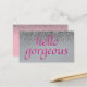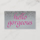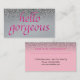 Observez les cartes attrapantes, roses et grises de rendez-vous de salon de beauté de regard en métal. Approprié à beaucoup d'entreprises connexes par beauté telles que des stylistes en coiffure, des maquilleurs, des cosmetologists, des stylistes de mode, des manucures, des consultants en matière de beauté, l'avant etc. lit "bonjour magnifique" dans des lettres de parties scintillantes de rose de faux sur un faux, arrière - plan balayé de regard de texture en métal de gris argenté recouvert avec les parties scintillantes grises d'ombre. Le dos fournit à des détails de date et de temps et d'affaires de contact de rendez-vous dans l'accent assorti, rose et gris de parties scintillantes d'ombre la couleur rose solide d'arrière - plan. La couleur d'arrière - plan peut être dessus changé dos, aussi bien que couleurs et/ou styles des textes sur le dos. Complétez le modèle de votre propre information d'affaires de beauté. D'autres cartes personnalisables de rendez-vous de boutique sont disponibles dans notre magasin de Zazzle.com/angela65.