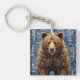 Lebhafte Kunstwerke, die einen Bären mit einem reichhaltigen, strukturierten Pelzmantel darstellen, Set vor einem Flickwerk in Blau- und Grautönen. Der Bär ist imposant und lebensecht und erobert die Aufmerksamkeit mit seinen realistischen Merkmalen.