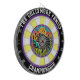 Ein gewagtes kreisförmiges Design eines Grizzlybären im Wald, zentriert durch ein präzises Ziel.