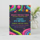 Eine lebendige und spielerische Geburtstagseinladung mit psychedelischem, Retro-inspiriertem Design. Der dunkle Hintergrund ist mit farbenfrohen, wirbelnden Formen, abstrakten Linien und lebhaften Tropfen in den 70er Jahren geschmückt. Die Grenze ist ein lustiges Muster von bunten Smiley mit Sternen und Blasen, die im gesamten Design verstreut sind. Der Text ist in einer Mischung aus kühnen und spielerischen Schriftart, wobei die wichtigsten Details in hellblau und rosa hervorgehoben sind.
