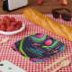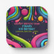 Eine lebendige und spielerische Geburtstagseinladung mit psychedelischem, Retro-inspiriertem Design. Der dunkle Hintergrund ist mit farbenfrohen, wirbelnden Formen, abstrakten Linien und lebhaften Tropfen in den 70er Jahren geschmückt. Die Grenze ist ein lustiges Muster von bunten Smiley mit Sternen und Blasen, die im gesamten Design verstreut sind. Der Text ist in einer Mischung aus kühnen und spielerischen Schriftart, wobei die wichtigsten Details in hellblau und rosa hervorgehoben sind.