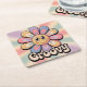 Dieser Untersetzer zeigt ein psychedelisches Retro-Bild einer lächelnden Sonnenblume mit einer grooven Ästhetik. Die Blume hat eine goldgelbe kreisförmige Mitte mit einem geschwungenen Lächeln und großen Cartoon. Die Blütenblätter sind kreisförmig angeordnet, mit einem Farbverlauf von Rosa, lila, Blau, Orange und Gelb, wobei jede Blüte eine glänzende, gekrümmte Kante hat. Der Text Groovy erscheint unten in einem abgerundeten 70er-Schriftart mit Schatten. Der Hintergrund zeichnet sich durch ein radiales Farbverlaufsmuster aus, das von Rosa zu lila zu Minze grün wechselt und einen klassischen psychedelischen Krawatte-Farbeffekt erzeugt. Die gesamte Illustration hat eine Vintage, ästhetische Ästhetik der 60er Jahre mit sanften Kurven und einem spielerischen, fröhlichen Design. Der Untersetzer ist ein Untersetzer aus viereckigem Zellstoff. Es sind sechs Untersetzer im Untersetzer Set.