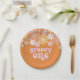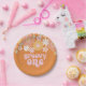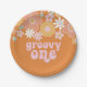 Retro inspirierte groovy 1. Geburtstag Teller mit 70er-Stil Blume und boho Schriftart und Farben.
