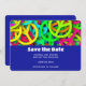 Save the Date Karte mit 60er Jahren. Coole Friedenszeichen in leuchtenden und lebendigen Neonfarben mit allen Farben des Regenbogens.