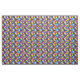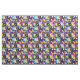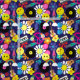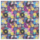 Funky Hippie-Stoff, bedruckt mit Regenbogen, Vinyl-LPs, Friedenssymbole, Blume, Kassetten und Retro-Sonnenbrille auf dunkelblauem Hintergrund