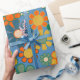 Groovy Retro farbenfrohe 60er 70er floral Muster Umschlagpapier. Lebhafte, farbenfrohe, hübsche, nahtlose Wiederholungsmuster mit Vintager Ästhetik und Hippie-Atmosphäre in lebhaften Blau-, Orange-, Senf- und Grüntönen. Von Kierkegaard Design Studio.