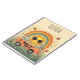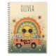 Dieses personalisierte, mit 70er inspiriert Notizbuch verfügt über eine warme, lächelnde Sonne mit überdimensionaler Sonnenbrille, rauschenden Regenbögen, Gänseblumen und einem Retro-VW-Van mit "Baby an Bord".