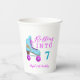 Groovy Skaten Geburtstagsparty Papier Tasse mit Darstellung eines Retro-rosa und blauen Roller Skate. Im Text steht "Rolling in X(age)".