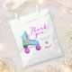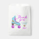 Groovy und lustige Skaten Thema Geburtstagsparty Gunst Tasche mit der Illustration eines rosa und blauen Roller Skate. Im Text steht: "Danke, dass du mitgemacht hast."