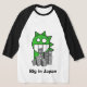 Ein Shirt mit einem abstrakten Bild einer riesigen Eidechse, die hochragt über einen Cityscape, mit dem Titel "groß in Japan."