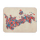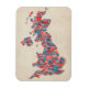 Eine typografische Textkarte von Großbritannien, die über 400 Städte und Gemeinden im Vereinigten Königreich in Rot und Blau auf Vintagem Hintergrund zeigt.