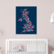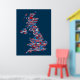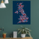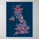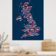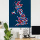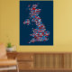 Eine typografische Textkarte von Großbritannien mit über 400 Städten und Städten im Vereinigten Königreich, rot, weiß und blau auf blauem Hintergrund.