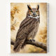 Eine majestätische große Hornkeule ist in einem Baum, umgeben von braunen Herbstblättern, auf einem neutralen sandigen Hintergrund, ein schönes Notizbuch, und perfekt für alle, die Eulen, Vögel, Natur und die Natur Lieben.