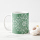 Dieses weiße Mandala liegt auf einem graugrünen Hintergrund. Die Farben sind natürlich und entspannend. Teil der Losonieth Mandala Kollektion.