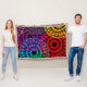 Diese Wurfdecke hat ein Schwarzes Geschichtsbild von großen Kreisen gebildet, die aus raindrop Formen und Kreise in rot, gelb, lila, grün und türkis gebildet werden.