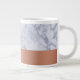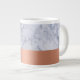 Diese große Kaffeemaschine ist mit einem schwarz-weißen Marmor ausgelegt, auf dem ein Kupferakzent rund um die Tasse angebracht ist.