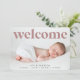Ein hübsches und elegantes Geburt-Ankündigungsdesign mit einem vollblutenden, horizontalen oder landschaftsorientierten Foto mit "Begrüßung" überlagert oben in Retro-Blockschrift. Der Name Ihres Babys und die Geburtsdaten erscheinen unten in dunkler Kohle. Fügen Sie drei zusätzliche quadratische Fotos auf die Rückseite, zusammen mit einer persönlichen Nachricht.