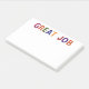 Dieses 10 x 6 Pad von Post-its Noten ist perfekt für jedermann! Mit seinem hellen, fröhlichen Sprichwort und dem klassischen Blockdruck "Great Job" wäre es großartig, jedem, der in letzter Zeit eine großartige Arbeit geleistet hat, zu geben, oder es wäre eine wunderbare Notiz, um jemandem das Mittagessen, den Schreibtisch, die Schularbeit, den Computer, usw. aufzustellen.