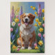 Ein fröhlicher Hund sitzt friedlich auf üppig grünem Gras, umgeben von bunten Frühlingsblüten unter einem weichen blauen Himmel. Dieses digitale Ölgemälde erfasst einen ruhigen Moment mit ausdrucksvollen Pinselstrichen, warmen Farben und einem Gefühl sanfter Freude.