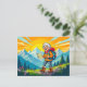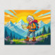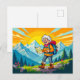 Ältere Großmutter wandern in den Bergen mit Rucksack und Trekkingsteinen, lächelt glücklich. Humorvolle und farbenfrohe Illustration über Senior Lifestyle, Natur, Fitness und fröhliche Altersabenteuer.
