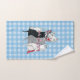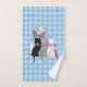 Cette serviette à main pour votre salle de bain a un groupe de trois chatons avec des arcs roses assis avec leur chatte mère sur un arrière - plan plaid bleu et blanc. Les chats sont blancs, noirs et gris.