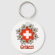 Stilvolle Edelweiss umgeben eine Schweizer Fahne mit dem freundlichen Schweizer Gruß unten.